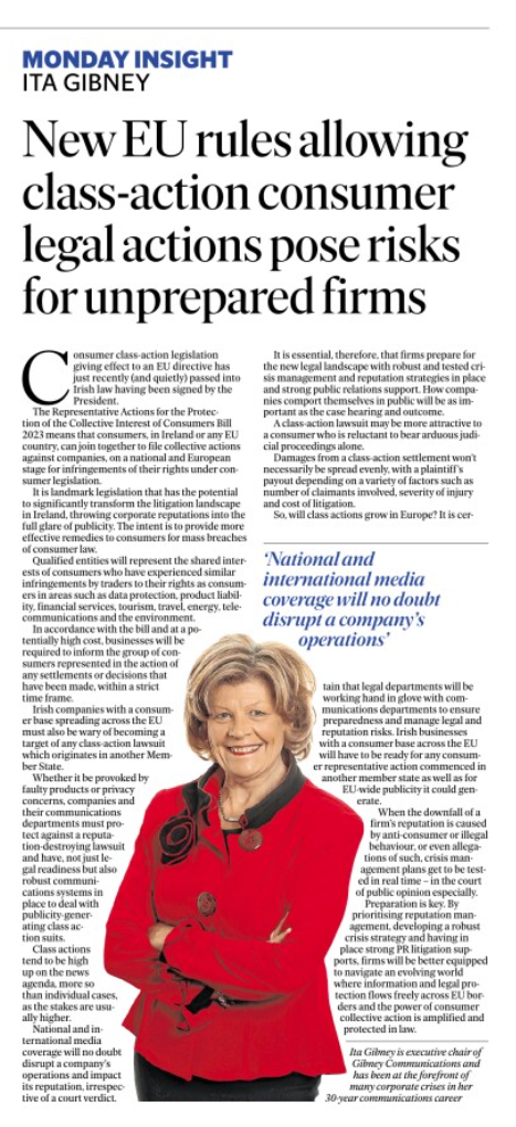 Ita Gibney, Executive Chair of Gibney Communications, writes on the issue of consumer class-action legislation in the Irish Independent